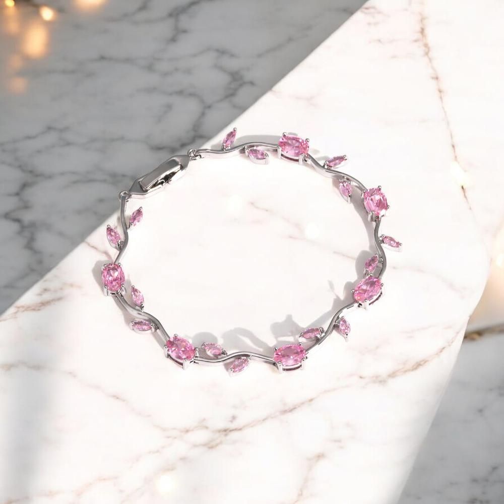 Add a touch of elegance to your jewelry collection with this Anti Tarnish Pink Crystal Tulip Bracelet. Designed with a delicate vine-inspired structure, this bracelet features sparkling pink crystals set beautifully on a premium gold-plated base.