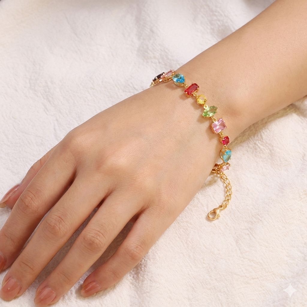 This multicolor crystal bracelet for women is crafted to elevate your jewelry collection with its vibrant charm and premium finish. The bracelet features a series of carefully set multicolored crystals in unique cuts such as pear, oval, square, and emerald shapes. Each crystal reflects light beautifully, creating a sparkling look from every angle.