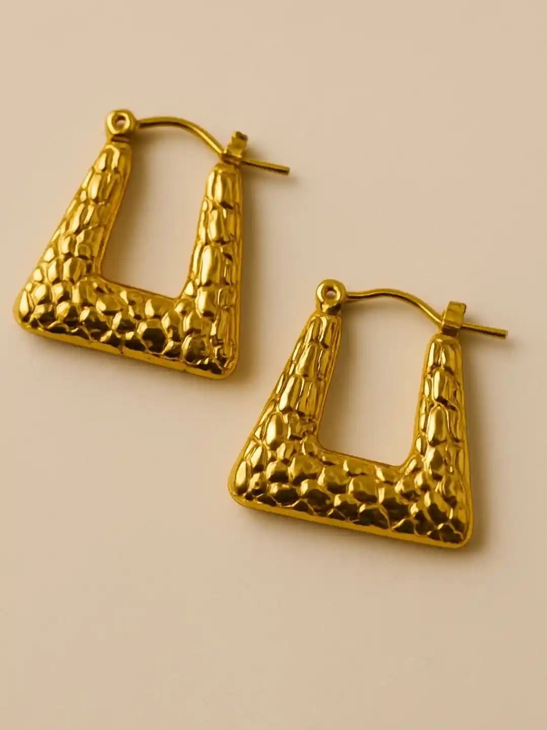 Make a bold style statement with these hammered gold geometric hoop earrings. Designed in a modern square silhouette with a textured hammered finish, these earrings bring a perfect blend of contemporary design and timeless elegance. The high-polish gold tone adds a luxurious touch, while the lightweight structure ensures all-day comfort. Ideal for both everyday wear and special occasions, these earrings effortlessly elevate any outfit.