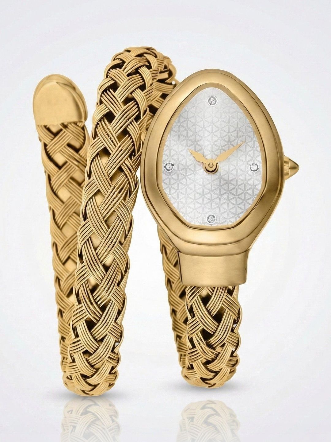Add elegance to your everyday style with this luxurious gold-tone braided bracelet watch. Designed with a unique woven bracelet strap and a sleek oval dial, this watch blends timeless sophistication with modern minimalism. The delicate textured dial with crystal hour markers enhances its premium appeal, making it perfect for both casual and formal occasions.