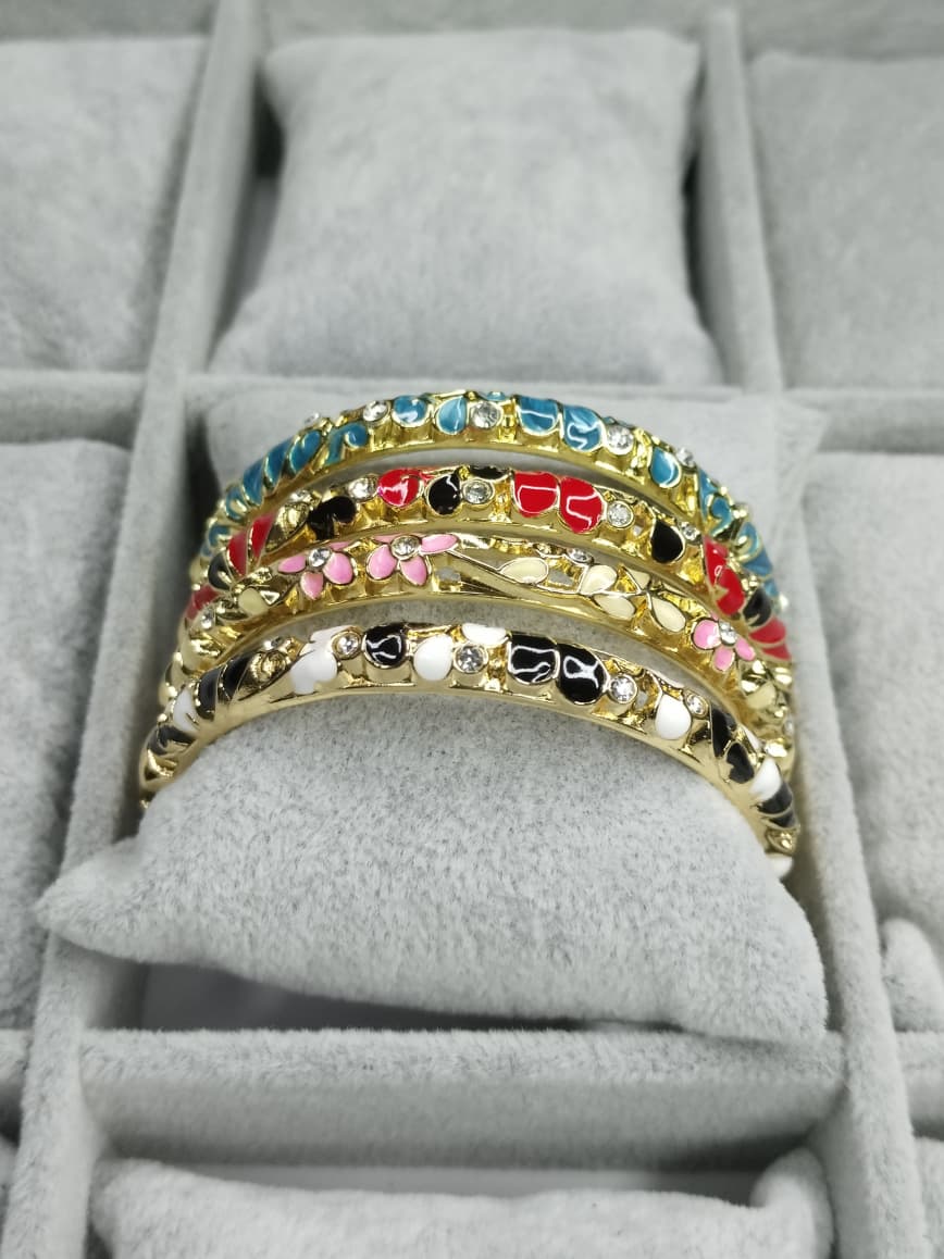 Each bangle is finished with a premium gold polish that enhances its luxurious appeal and ensures long-lasting shine. Made from high-quality alloy with durable enamel coating, these bangles are lightweight, skin-friendly, and comfortable for all-day wear. The smooth inner finish allows easy slip-on wear without irritation.